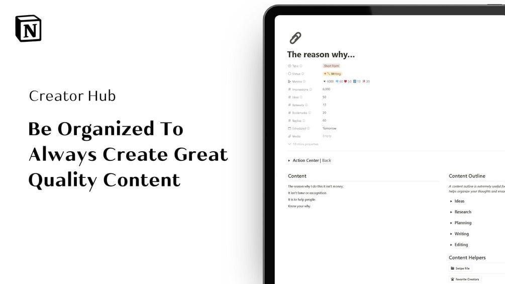 Creator Hub is a ready-to-use Notion system designed to help you plan, write higher-quality content, improve your brand, and organize your content creator's life. It is designed for ๐• (previously known as Twitter).